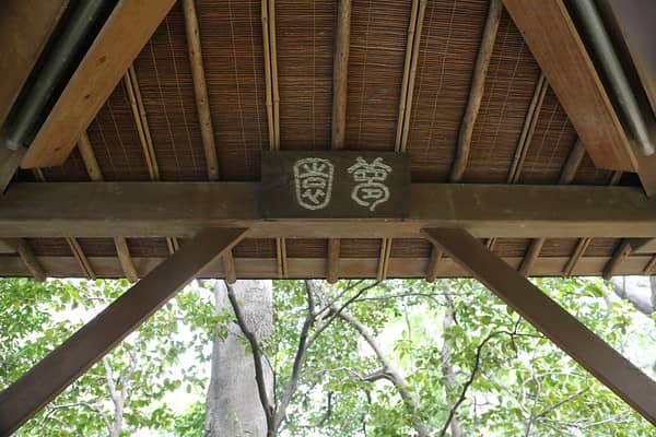 Theehuisje in de tuin met een calligrafie "Droomland" door oud-Ambassadeur Van Gulik